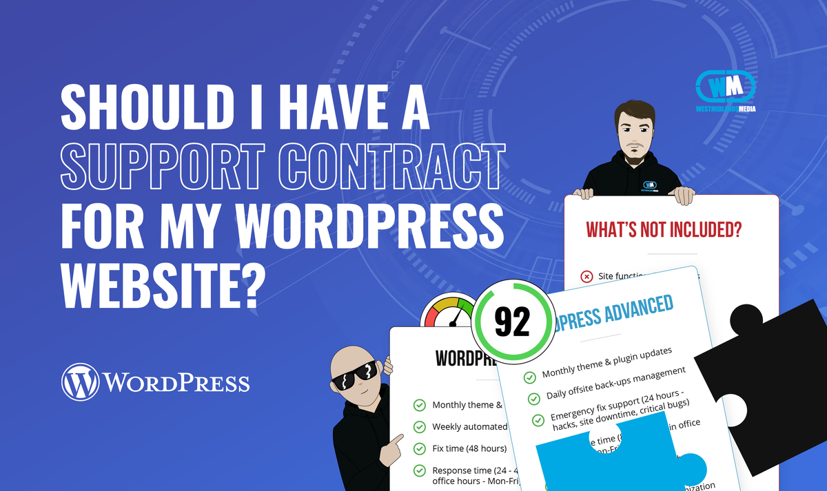 WordPress websites are not just a one time set-up. They require maintenance to ensure that your site stays up to date with the latest plugin, theme or Wordpress version. Updates are released regularly, security threats become more advanced, and small issues can appear over time that are easy to miss until they start affecting your site. This is why here at West Midlands Media we offer a support contract to take care of these issues for you.
